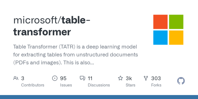 Table Transformer (TATR) is a deep learning model for extracting tables from unstructured documents (PDFs and images). This is also the official repository for the PubTables-1M dataset and GriTS ev...GitHub
