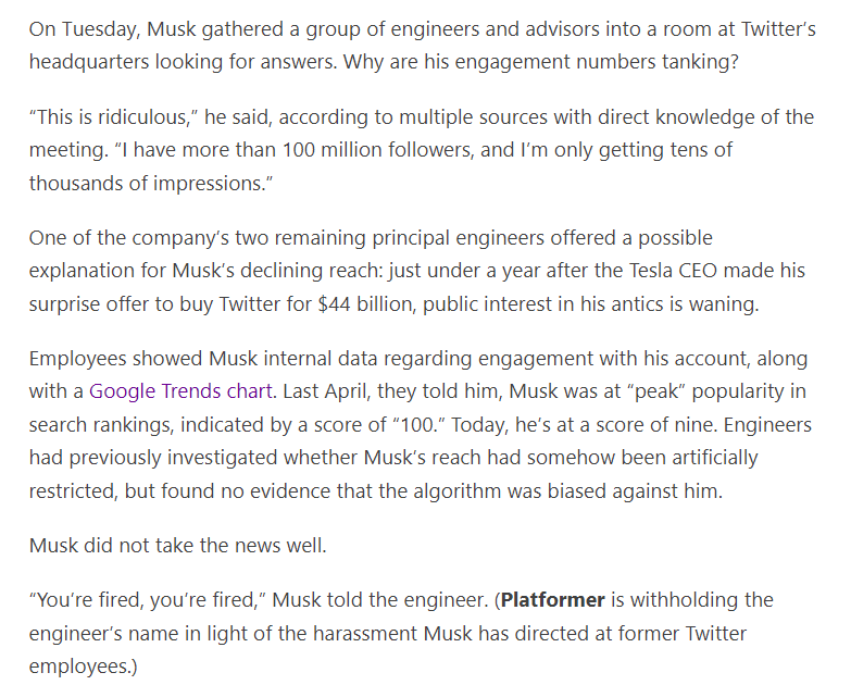 Twitter is falling apart. I currently can’t follow anyone or post anything. In the midst of this, Musk had a meeting to find out why his engagement is plummeting.