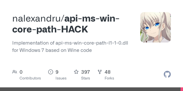 ahaaha. github.com/nalexandru/api-ms-w… -: GitHub - Implementation of api-ms-win-core-path-l1-1-0.dll for Windows 7 based on Wine code. Good job, person who just helped me get Tweesecake running on Windows 7. So far, it's been fairly painless to get modern things going on it.