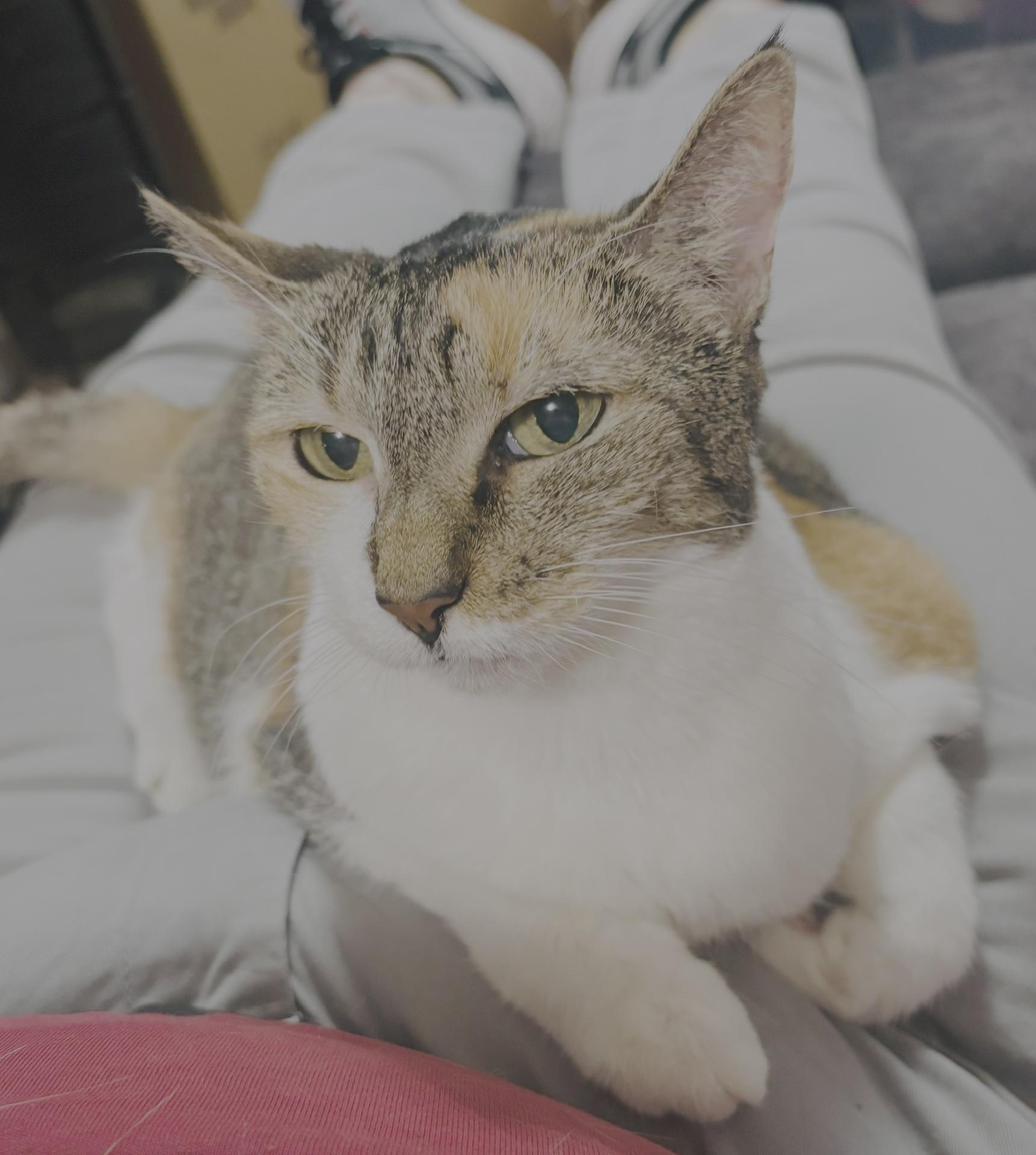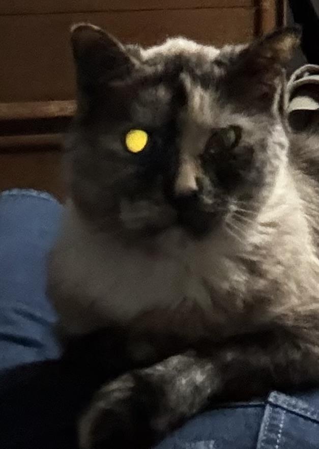 Noodle: She's a tortoimese. The photo where her eye looks like a laser captures her personality best. She was rescued at fourish months, and hid in a ramen noodle box. I am her human, and she is finally accepting attention from my partner (we moved in in February, 2020). She didn't meow or play until I adopted Fur Elise. She stays.