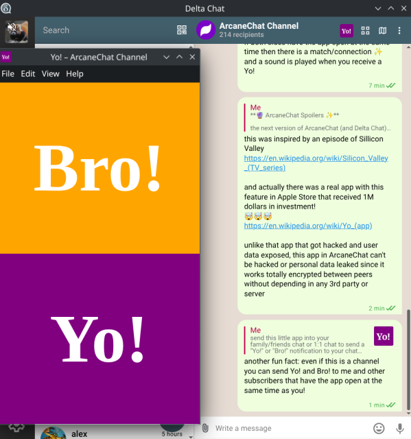 Attached: 1 image created an small #webxdc app for #DeltaChat / #ArcaneChat as a joke to quickly send a "Yo!" or "Bro!" notification to your chat pals! this was inspired by an episode of #SilliconValley https://en.wikipedia.adb (Mastodon)