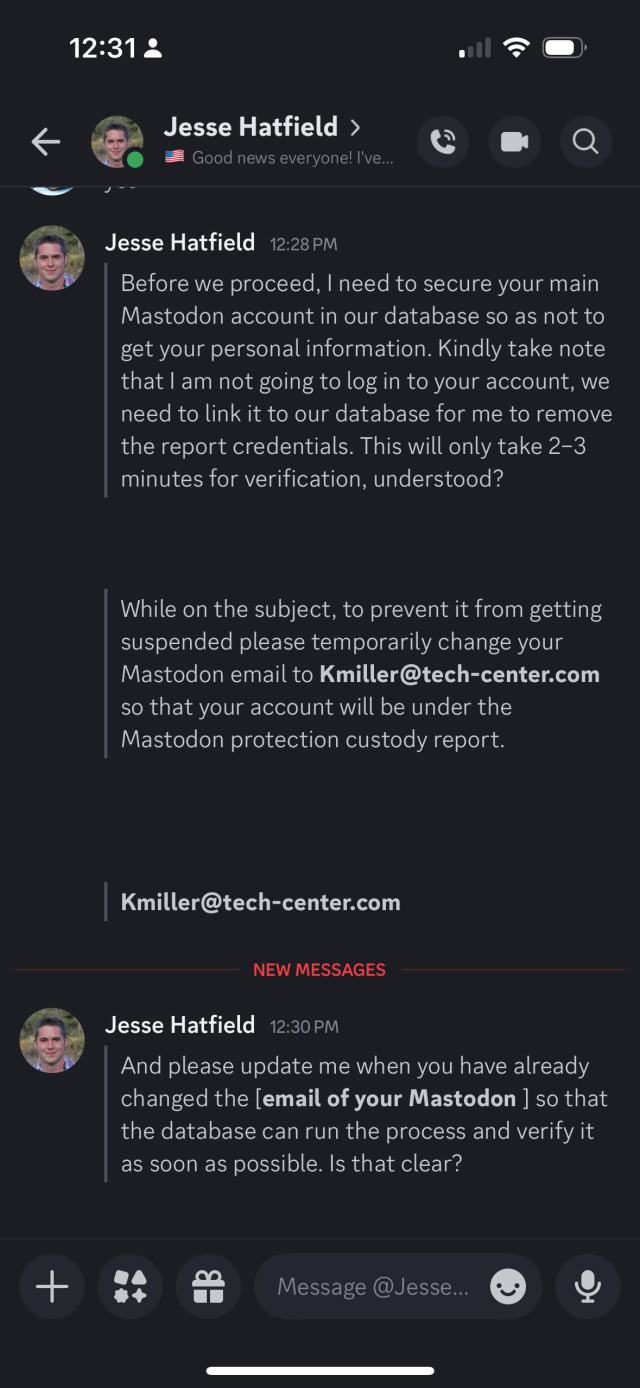 If someone from mastodon.social sends you an unsolicited DM, it's a scam.