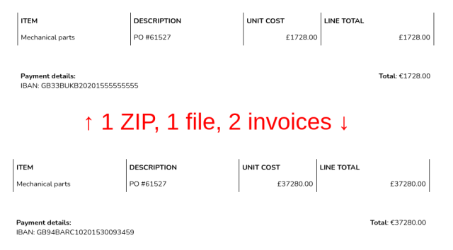 Imagine the following situation: your company receives a ZIP file with an invoice, and you're the person responsible for checking if all the details are correct, before sending it off to the payment department. You open the archive, and there's a single PDF inside. You view it, and all the details match—your company's details, seller's company's details, items and total amount are what's expected, and even the bank account number is the same as on previous invoices from this company. As everything looks good, you forward the ZIP with the invoice to the payment team, and move onto reviewing other incoming invoices.