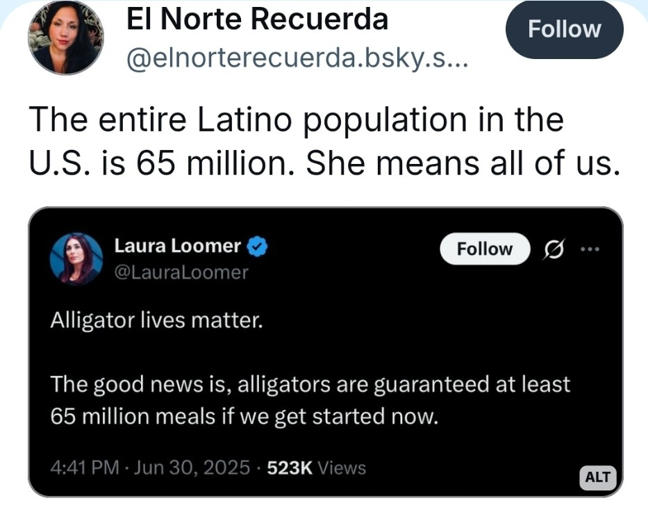 Laura Loomer is an advisor to Trump, and she's quite clear that what's going on is not "deporting criminal aliens" but the ethnic cleansing of all 65 million Latinos in the US. In fact she's pretty clear she wants this to be the genocide of the US Latino population.