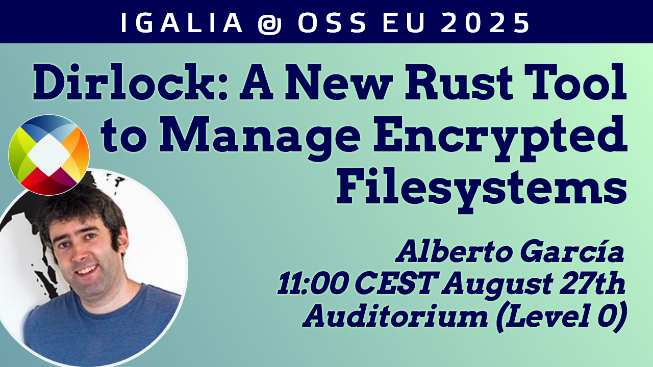 Tomorrow at #OSSummit, Alberto García will present "Dirlock: A New Rust Tool to Manage Encrypted Filesystems" at 11:00 CEST in the Auditorium (level 0).