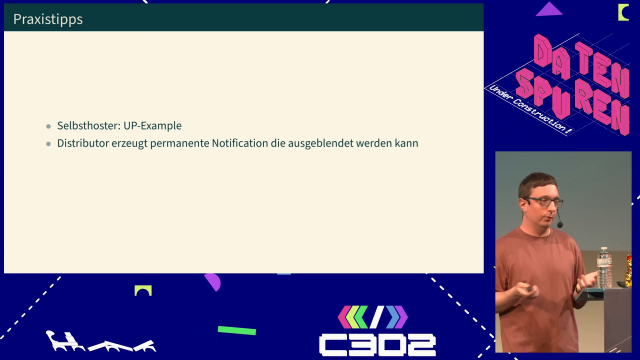 The list below shows talks that have covered UnifiedPush. We thank these community members who have taken time and energy to spread the word about UnifiedPush! [DE] 2025-09-20, UnifiedPush, Daniel Gultsch at Datenspuren: description, recording, recor…UnifiedPush