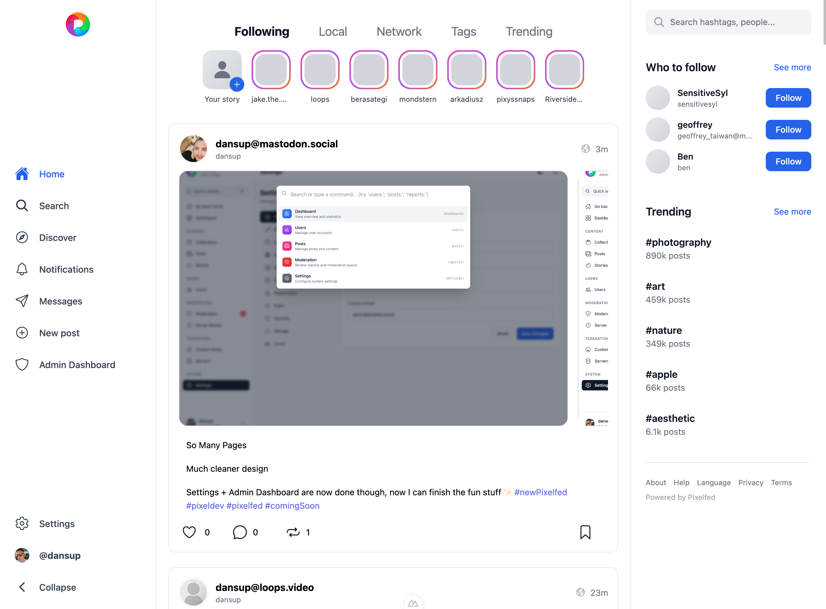 The new @PixelFed redesign is rapidly taking shape and will replace the entire existing webUI (admin dashboard, settings, guest UI, user UI, legacy UI)!