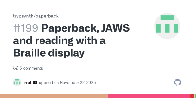 JAWS currently has a bug in it that makes Braille display users unable to properly read long lines in Paperback, or any application using wxWidgets, for that matter. When I tried to follow up on this issue three times with a Vispero contact who assured me it would be fixed in the December 2025 JAWS update, I got silence, so it's time to get louder. If you're effected by this problem, or just feel like sending a support email to Vispero to help me out, I'd much appreciate it! CC @freedomscientific