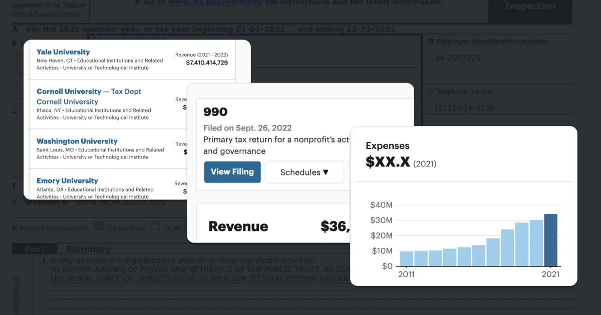 Since 2013, the IRS has released data culled from over 1.8 million nonprofit tax filings. Use this database to find organizations and see details like their executive compensation, revenue and expenses, as well as download tax filings going back as f…ProPublica