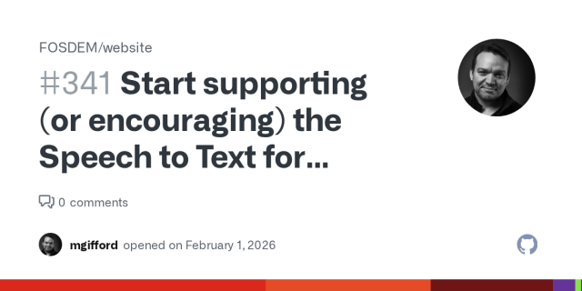 We should explore adopting or integrating the MidCamp Live Captioning project as part of FOSDEM’s accessibility efforts. https://github.com/MidCamp/live-captioning?tab=readme-ov-file#live-captionin...mgifford (GitHub)