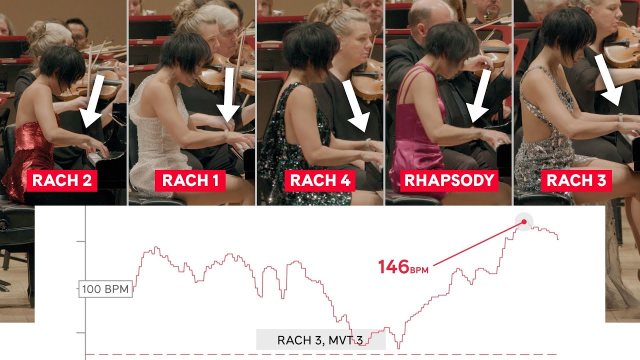 Not exactly scientific but fascinating: Yuja Wang did a marathon 2.5hr performance of Rachmaninov 1 2 3 4 and the Paganini Ode, and she, the conductor, orchestra members and audience members wore heart rate monitors throughout.