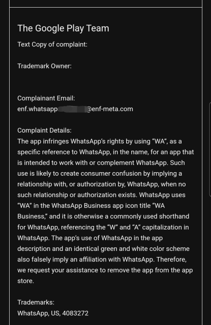 Speaking from our own history: we had to change our name from DAVdroid to DAVx5: You've almost zero chance. The first thing you would need is a lawyer and send them the official response and your sights. But at the end you will always be the weaker party (=less money). They will argue that you're free riding, using Whatsapp to make your own "business" ("your app wouldn't exist if there was no Whatsapp"). IMO u can only survive by removing any WA reference from text and images..
