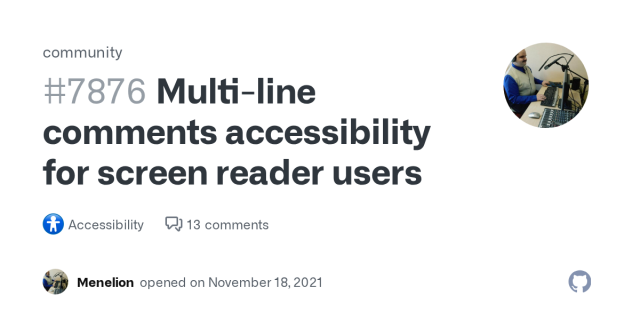 Hi again Carie! I was skimming through the comments on that discussion I created for multiline comments accessibility. And I wanted to bring one more thing: first, it would be nice to add it to the accessibility category. And second, the Accessibility category itself is a nightmare of a mess: lots of scam, lots of off-topic discussions. I'd be glad to help in cleaning this, but of course I have no access to do that.