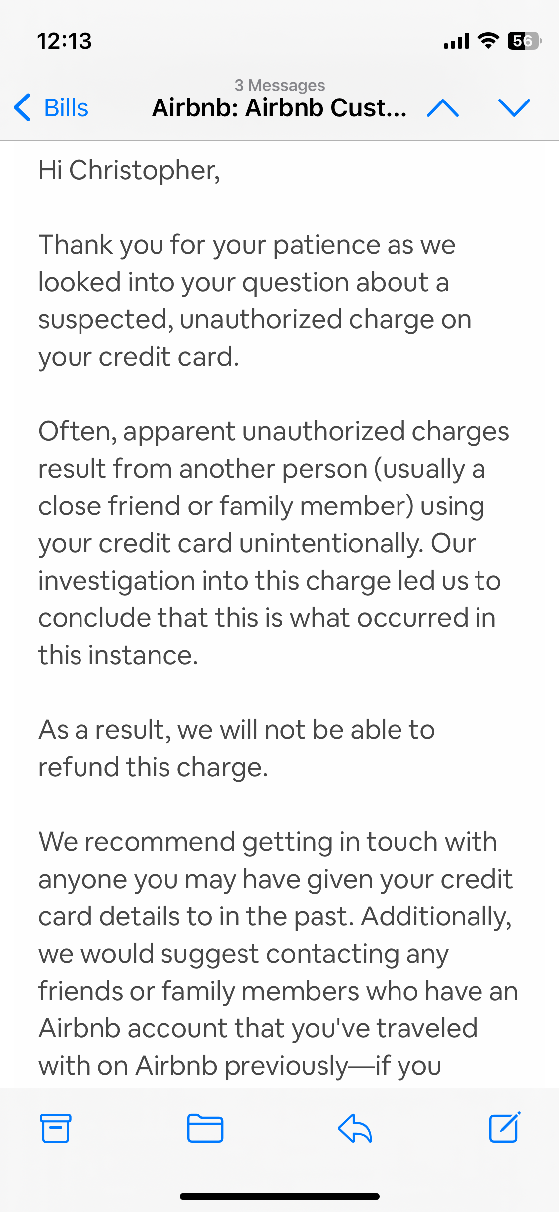 I recently saw an AirBnB purchase on my credit card. I did not make it. $CAD466 for a reservation in London. I have never even had my CC connected to AirBNB and my account is secure. It was obviously made by someone who got my CC info.
