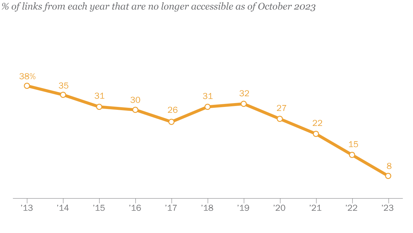 A quarter of all webpages that existed at one point between 2013 and 2023 are no longer accessible.Janakee Chavda (Pew Research Center)