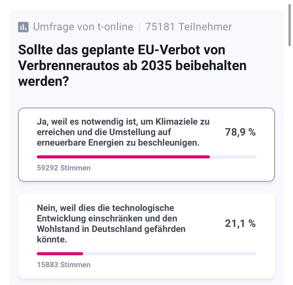 Hier gibts übrigens eine deutlich seriösere (heißt: mit etwas mehr Aufwand verbundene) Umfrage zum "Verbrenner-Aus" in Form einer Unterstützungs-Petition. Wäre schön, wenn da mindestens so viele Leute unterschröben wie bei den depperten Klick-Abstimmungen mitmachen, einfach, damit klar ist, dass die hohen Befürworter*innen-Zahlen tatsächlich realistisch und nicht "kriminell manipuliert" sind: duh.de/ja-zum-verbrenneraus/