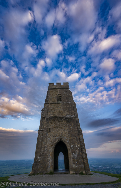 The image is of Glastonbury Tor, a hill capped by the ruins of a medieval church tower in Somerset, England. The tower is made out of light brown stone and appears to be quite tall. There is a doorway near the base of the tower. The sky behind the tower is blue and there are wispy white clouds.
