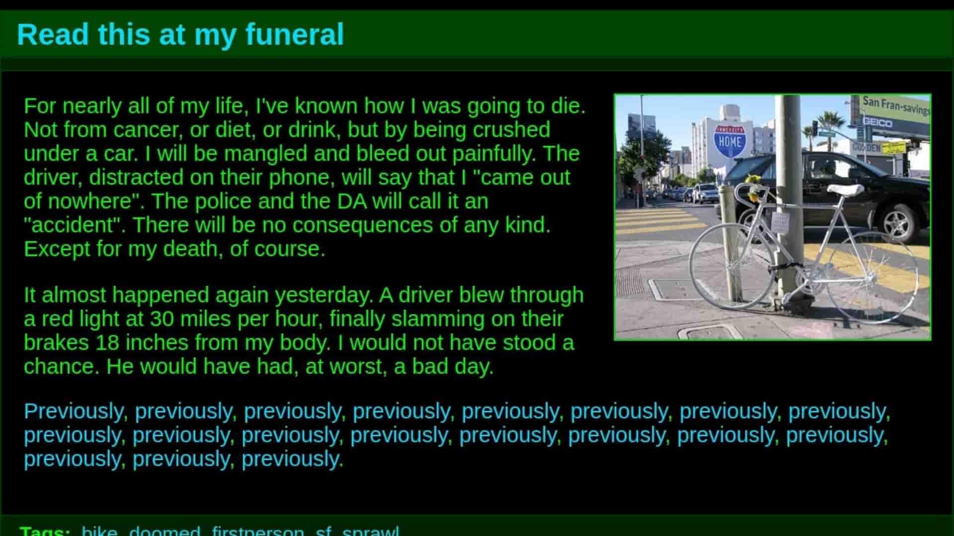 For nearly all of my life, I've known how I was going to die. Not from cancer, or diet, or drink, but by being crushed under a car. I will be mangled and bleed out painfully. The driver, distracted on their phone, will say that I "came out of nowhere". The police and the DA will call it an "accident". There will be no consequences of any kind. Except for my death, of course. [...]