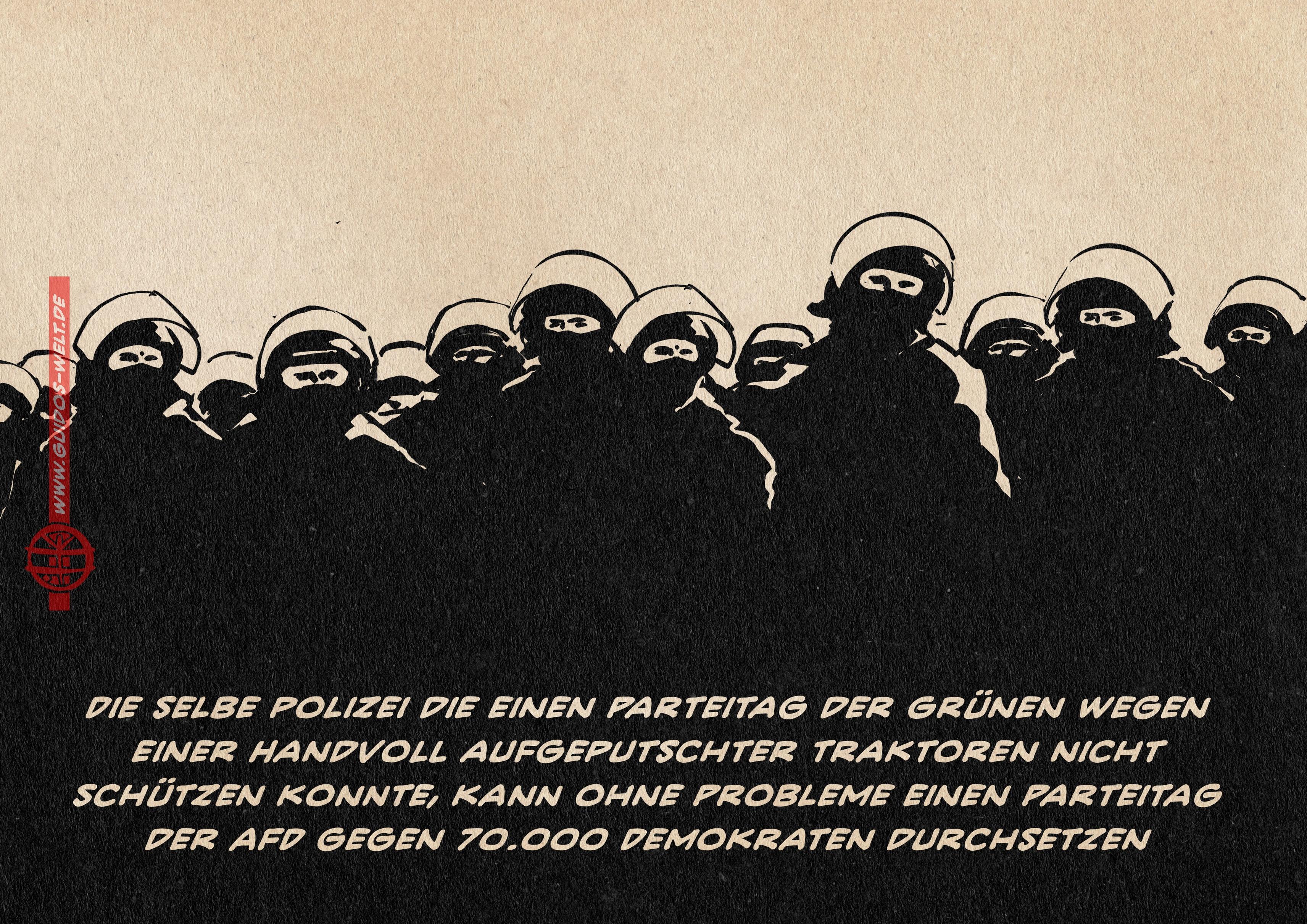 Die Frage auf welcher Seite die Polizei stehe wird von vielen als ungebührlich empfunden. Das ist bemerkenswert, denn der Kreisparteitag der Grünen war wegen einer Handvoll gewaltbereiter Traktoren nicht durchführbar–gestern waren 70.000 Menschen die den AFD Parteitag verhindern wollten kein Problem. Das Bedenkliche ist nicht, dass man diese Frage im Einzelfall stellen kann. Das bedenkliche ist, dass man diese Frage nicht stellen muss, weil die Polizei sie wieder und wieder von selbst aufwirft.