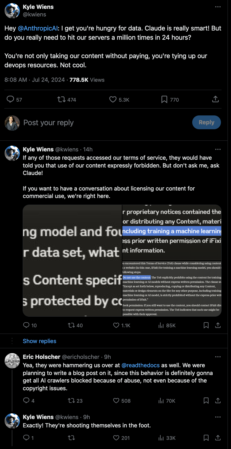 Now, the CEO of iFixit (supposedly ~$50M/yr revenue) calls 11 QPS, "abuse", saying "you're tying up our devops resources", implying it's reasonable for a $50M/yr regularly viral web property to need significant intervention if traffic increases by 11 QPS.