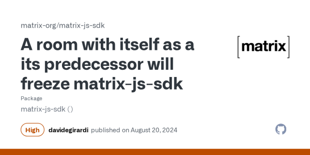We published a security fix for a High security vulnerability in Matrix JS SDK (CVE-2024-42369). Make sure to update your dependencies! See more at github.com/matrix-org/matrix-j…