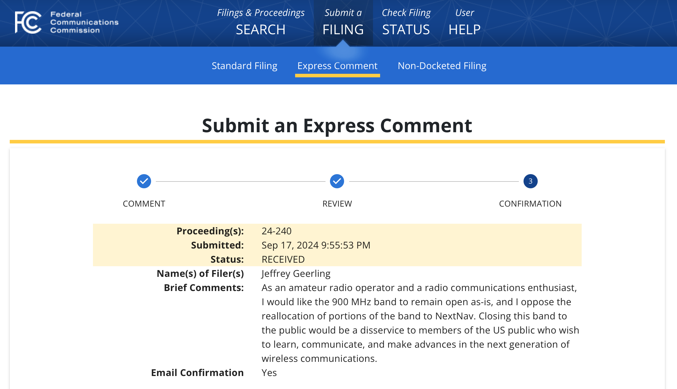 Saving the 900 MHz band for @meshtastic and other hobby uses. You can too! fcc.gov/ecfs/filings/express?p…