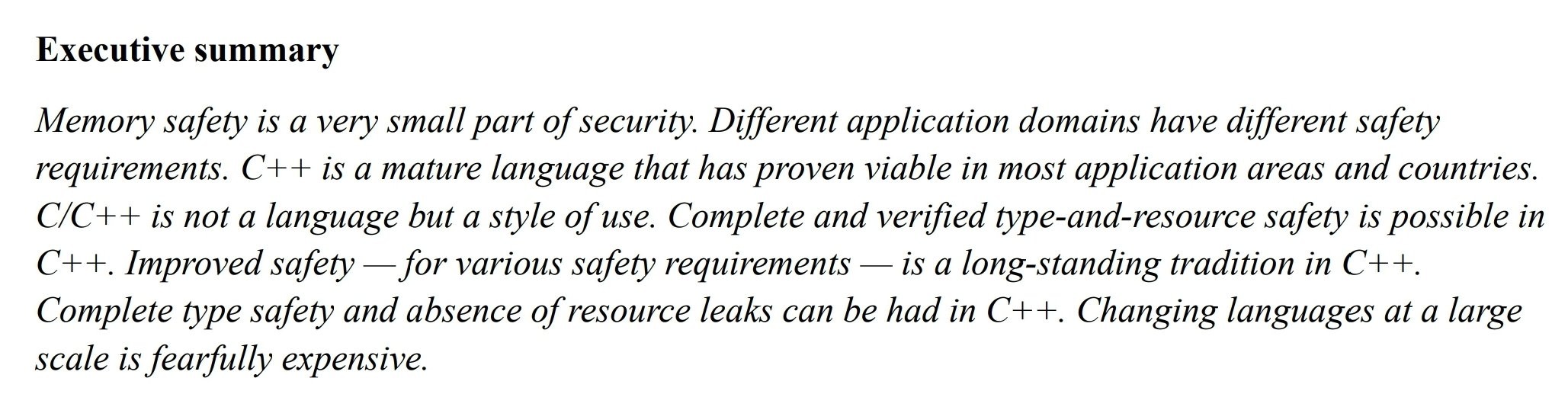 it would be very nice for the world and industry if what the C++ committee said here was true and if they actually cared about memory safety. but with a committee that writes nonsense like this, actively denying the problem, i don't see this happening.