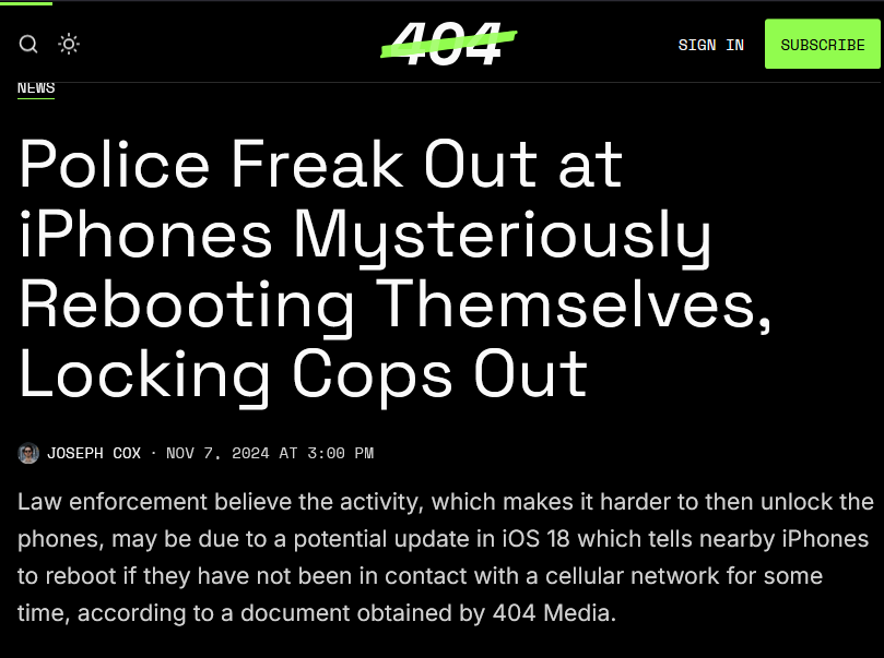 Law enforcement believe the activity, which makes it harder to then unlock the phones, may be due to a potential update in iOS 18 which tells nearby iPhones to reboot if they have not been in contact with a cellular network for some time, according t…Joseph Cox (404 Media)