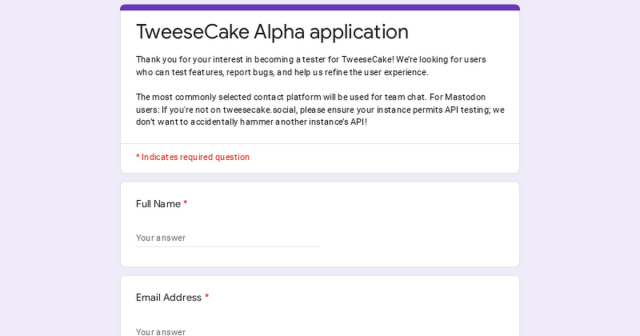 Thank you for your interest in becoming a tester for TweeseCake! We’re looking for users who can test features, report bugs, and help us refine the user experience. The most commonly selected contact platform will be used for team chat.Google Docs