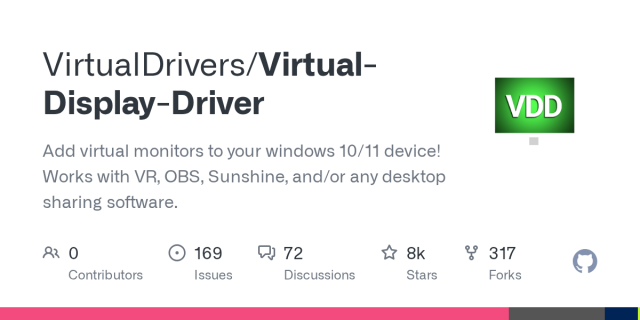 GitHub - VirtualDrivers/Virtual-Display-Driver: Add virtual monitors to your windows 10/11 device! Works with VR, OBS, Sunshine, and/or any desktop sharing software.