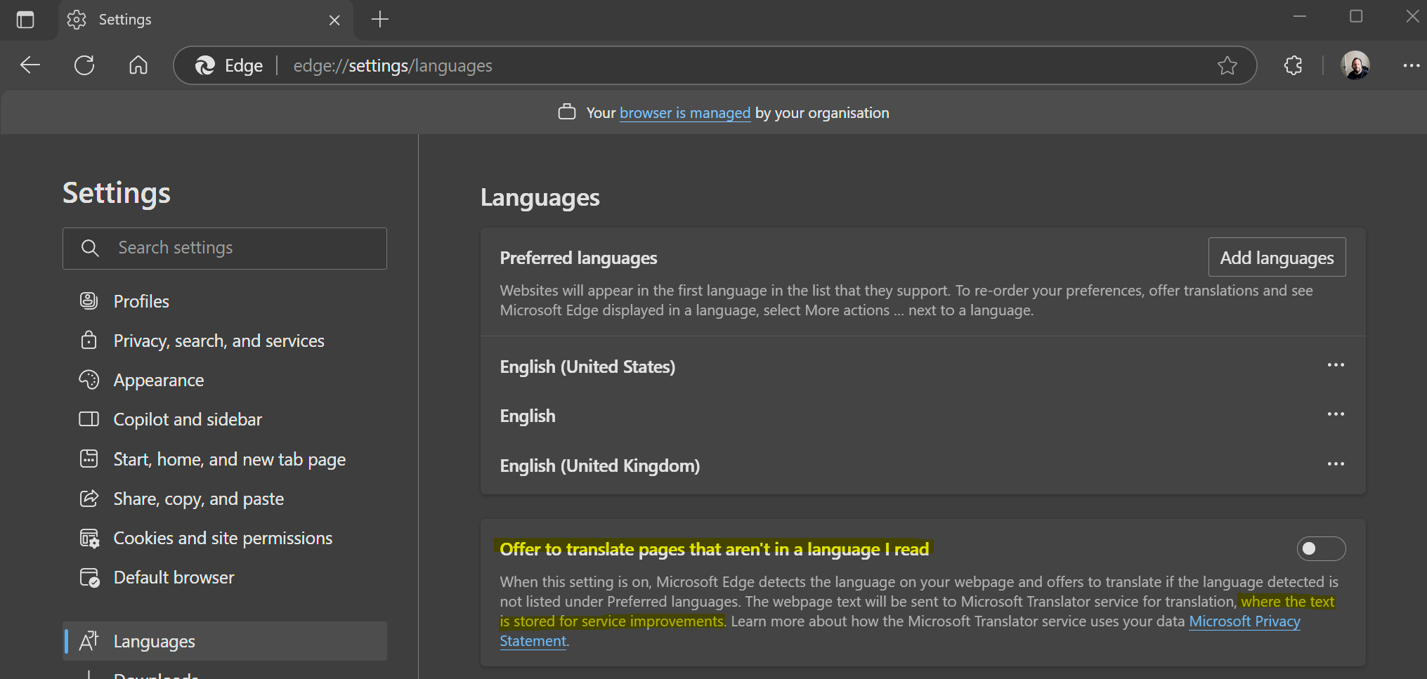 I would strongly suggest organisations disable Microsoft Translator for Edge. It's enabled by default, and allows users to automatically translate webpages (without prompt after first use) to native language by sending the entire page content to MS. This includes intranet sites and SaaS services.