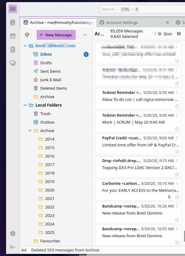Doing some house keeping today, and moving my mail service again... this time however I am taking the time to move my archives offline. This way moving mail providers will not have to be as hard in the future. Major call out to @thunderbird for making this so easy