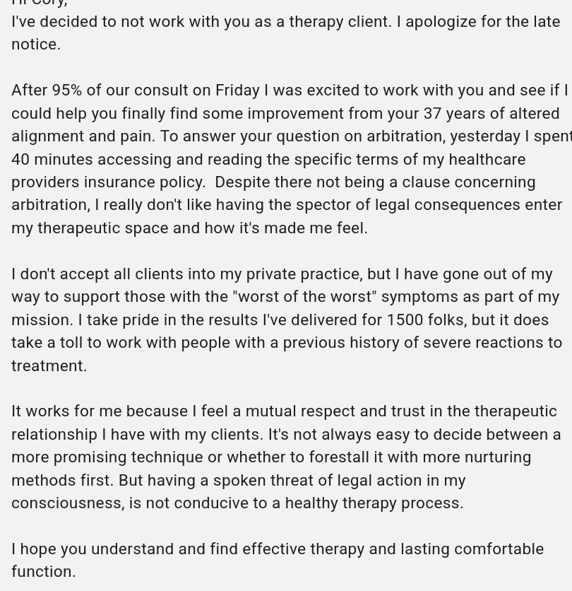 Set up an appointment with a new pain therapist. At the end of our intake call, I asked, "Hey, just to be clear, there's no binding arbitration waiver in your paperwork, right?"