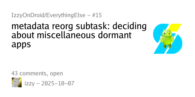 Should you wonder about the number of apps available in the #IzzyOnDroid repo slightly decreasing with the next sync: your gardeners were quite active again. Find details at codeberg.org/IzzyOnDroid/Every… – and be welcome to join the Cinderella, there are still many items left on the list!