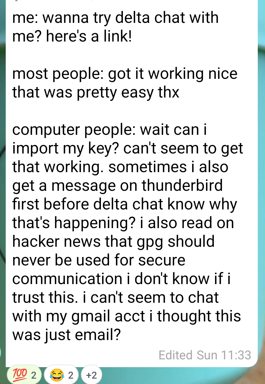 This year around, apart from one #chatmail relay setup workshop we didn't do any registered events at congress. Pushing out releases, Illnesses and engagements in various other organizing prevented more public sessions. Next ones will be around #fosdem2026 where also several of us will be around. Cheers!