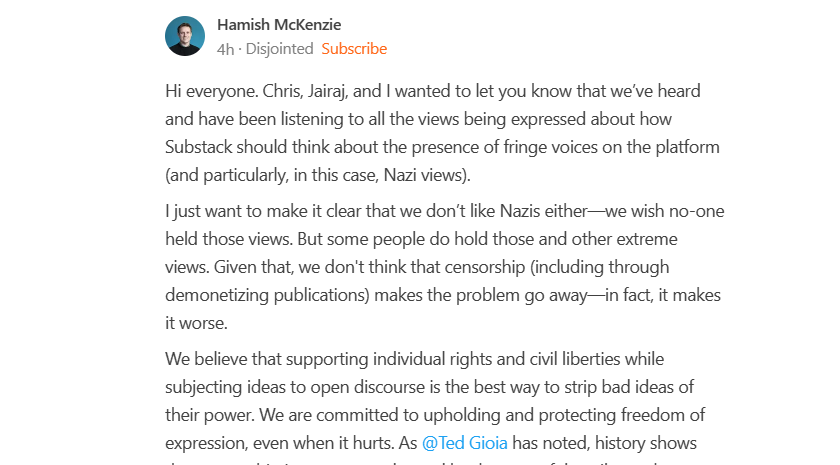 Substack co-founder Hamish McKenzie, "I just want to make it clear that we don’t like Nazis either—we wish no-one held those views. But some people do hold those and other extreme views. Given that, we don’t think that censorship (including through demonetizing publications) makes the problem go away—in fact, it makes it worse"