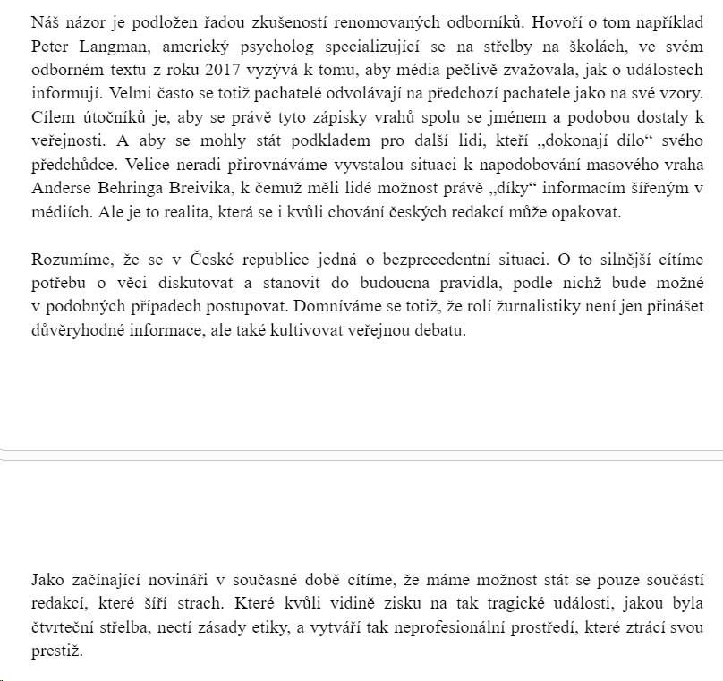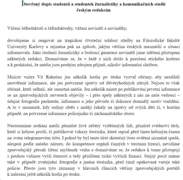 Strašně silná a důležitá slova studentů a studentek žurnalistiky. Jsou to právě jejich vrstevníci a mnohdy i kamarádi, kteří se stali terčem útoku.