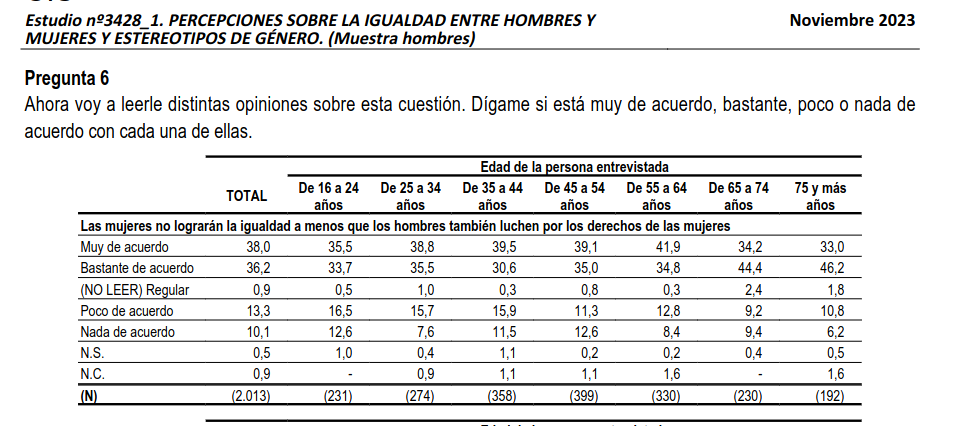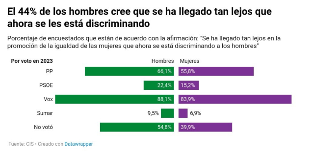in reply to modulux • • •Lo que muestra la gráfica es que el 88% de hombres y 83% de mujeres votantes de Vox cree que se discrimina a los hombres, a quienes hay que añadir un 66% de hombres y 56% de mujeres que votan al PP. Esos grupos son mayoritariamente los que componen ese tercio.