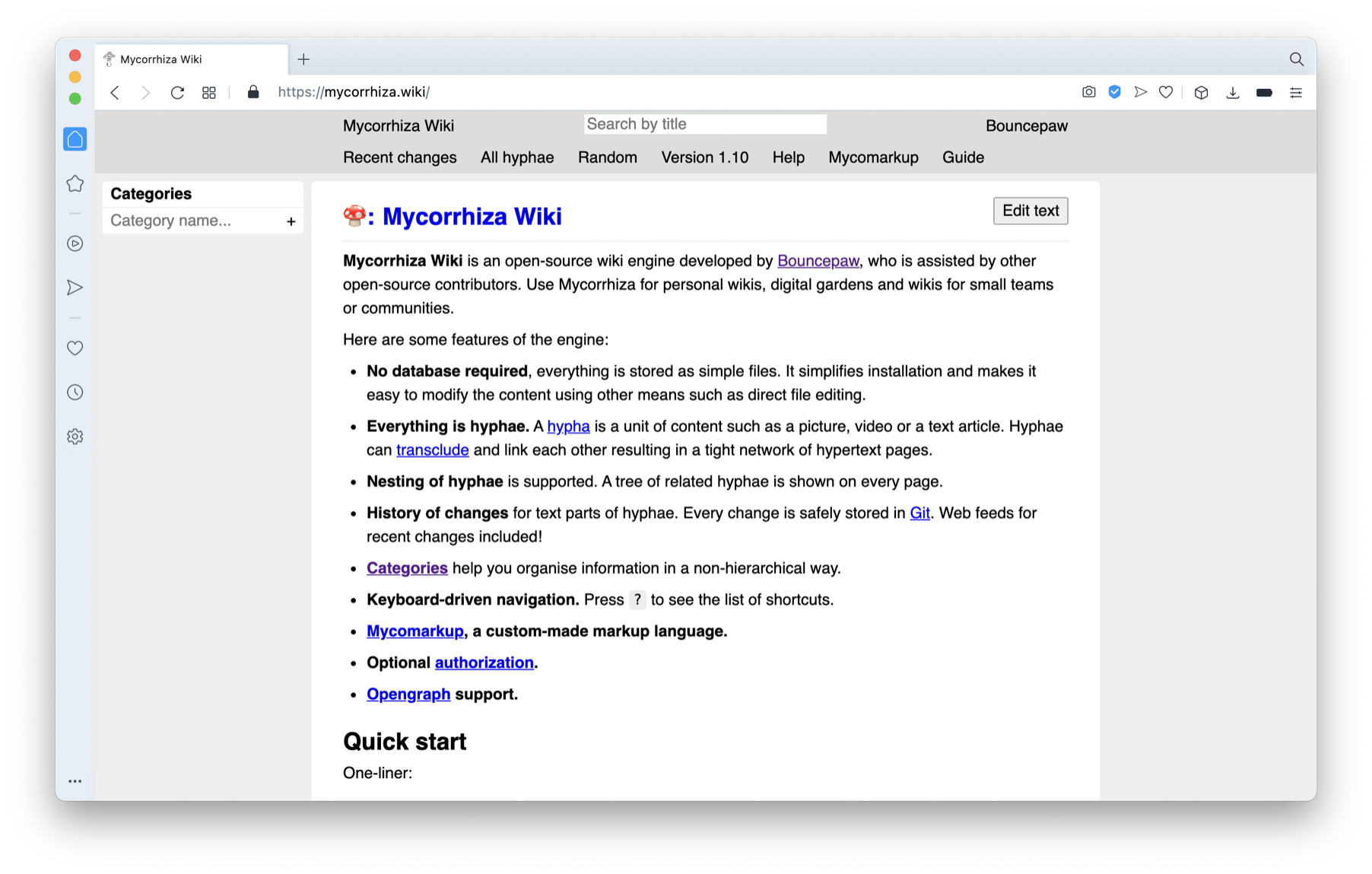 Introducing Mycorrhiza, a free self-hosted wiki engine, developed by @bouncepaw and the numerous contributors. It features file-based storage, history, a custom markup language, categories, among other features.