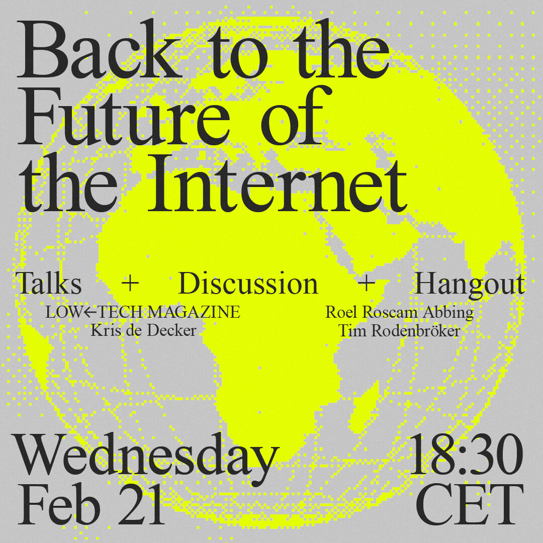 Based on this idea, Kris de Decker and Roel Roscam Abbing organize an evening exploring concepts from the Internet's history that can help create a more sustainable future internet. With talks by Kris De Decker, @rra and @timrodenbroeker