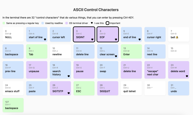 there are a lot of mistakes/missing nuance but I think it's really interesting how little structure there is. Special codes (like `3` for SIGINT) that are handled by the OS are mixed with just regular keypresses (like `13` for "enter”) which are mixed with codes that are handled by the application (like `1` for Ctrl-A in readline)