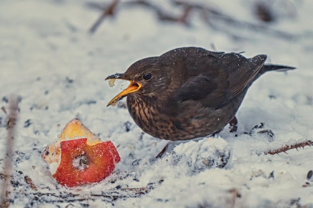 👇 Například kosy pohostíte jablky, strakapoudy potěší lojové koule, samozřejmě bez sítěk a palmového oleje. 🍎