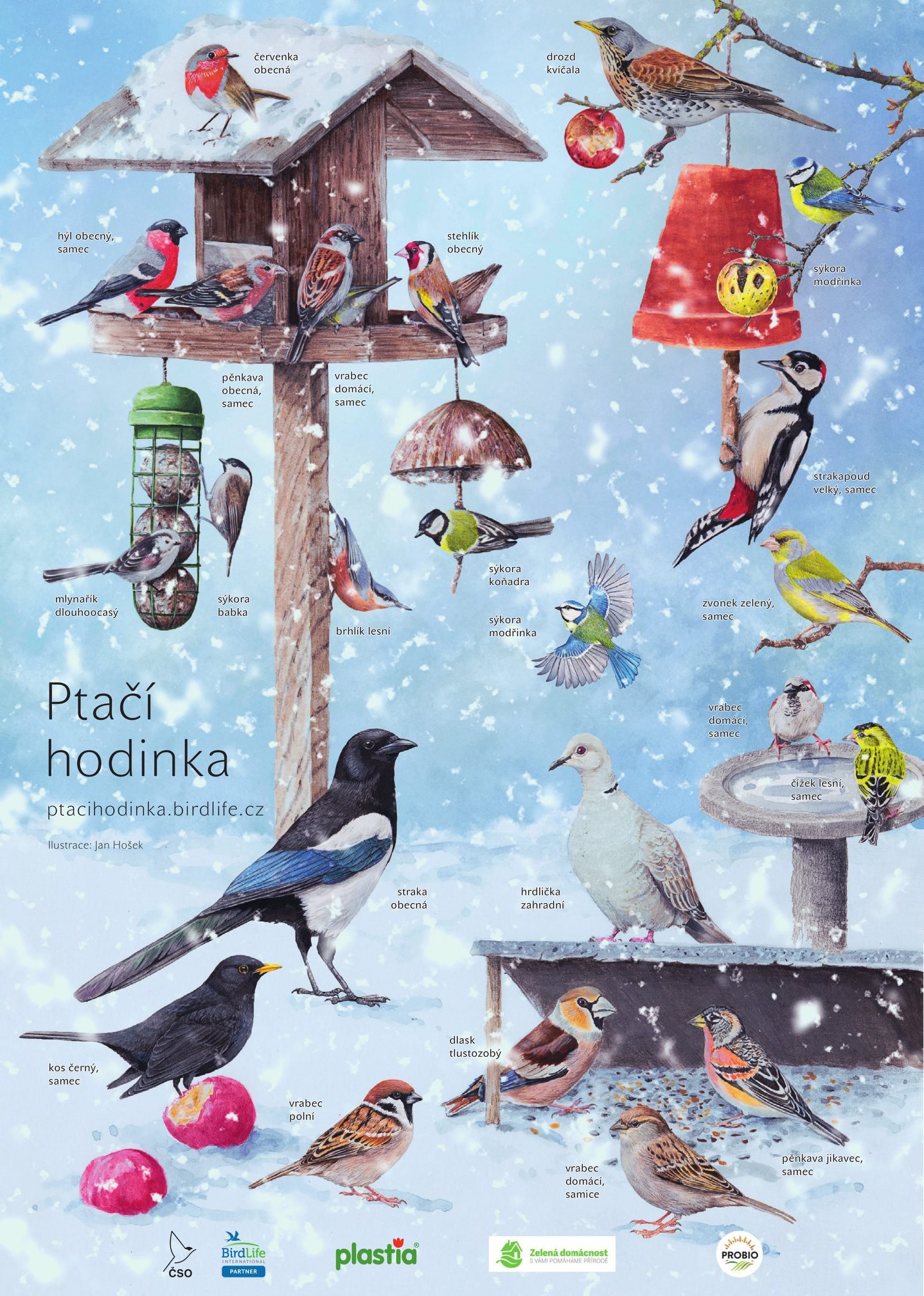 ✍️🖼 Na tomhle plakátu od ilustrátora Jana Hoška najdete časté návštěvníky krmítek.🐦 Pokud vám určování některých druhů dělá problém, můžete ho použít jako "tahák".😃