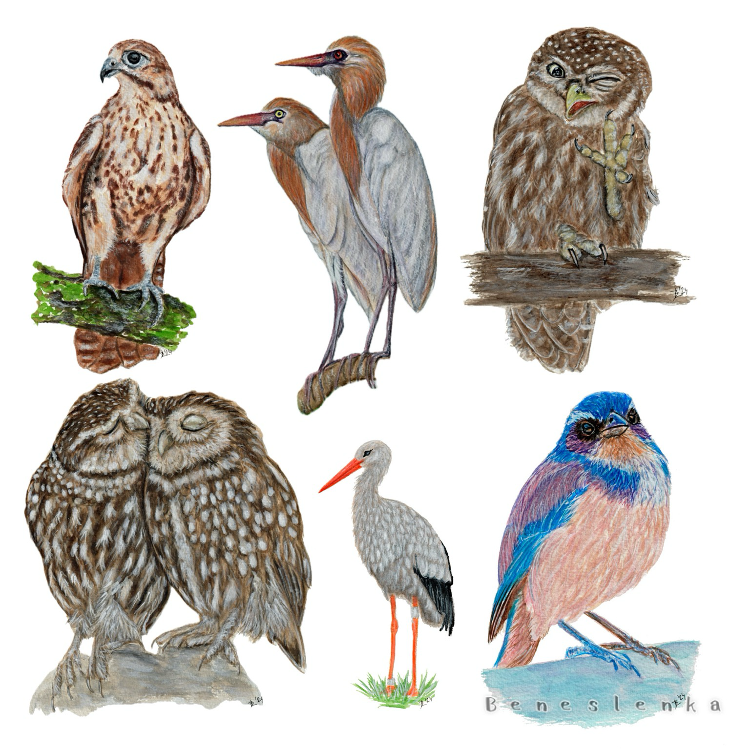 Dneska jsem pro vás vybrala raroha, volavky rusohlavé, kulíška, sýčky, čápa a sojku kalifornskou 😊