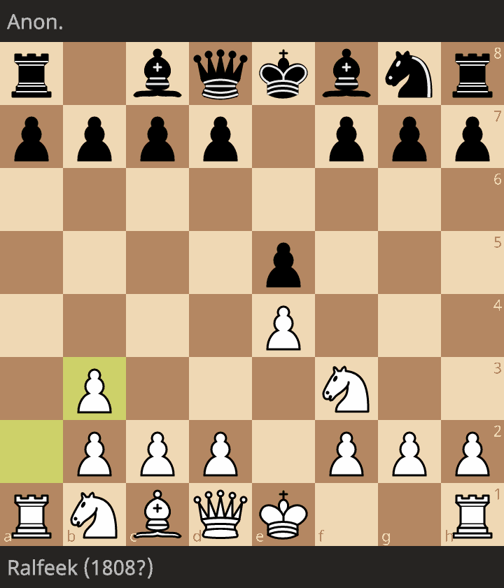 Ralfeek (1808?) is playing Anon. in a casual Correspondence game of chess. Game is still ongoing after 0 moves. Click to replay, analyse, and discuss the game!lichess.org