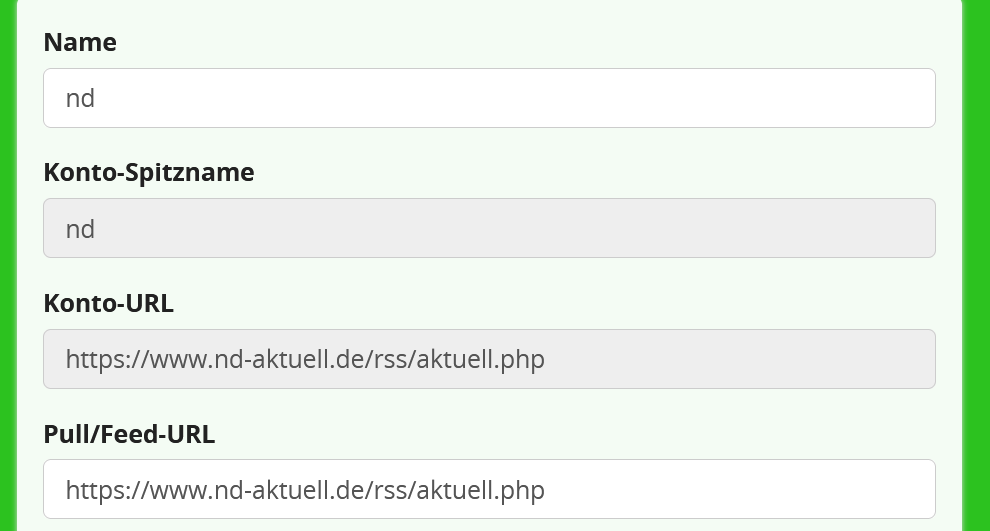 meinrss@anonsys.net) personalisiere, sie werden immer wieder ohne mein Zutun vom System geändert.In diesem Bespielfall ist der personaliserte Name Neues Deutschland, wird aber immer wieder in nd geändert. In anderen Feeds läuft es ähnlich ab.