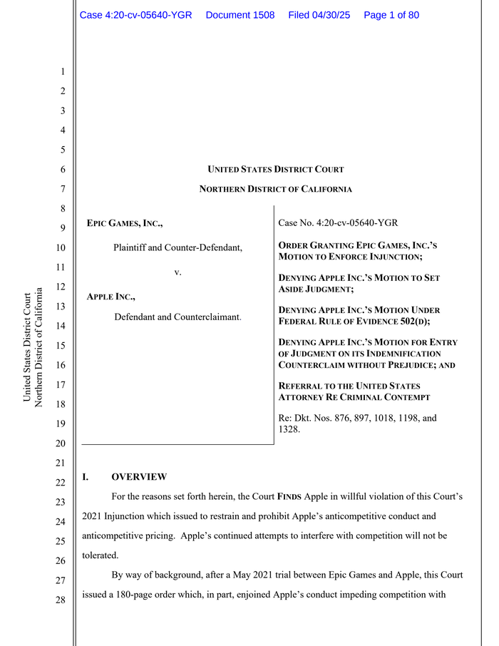 - In the Epic v. Apple case, the court has found Apple in willful violation of a previous injunction on anticompetitive conduct