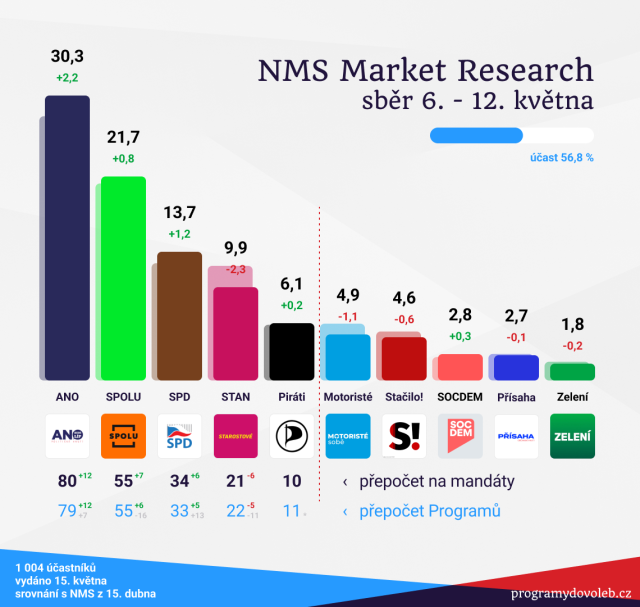 Čerstvý NMS Market Research posílá za mimo Sněmovnu Motoristy i hnutí Stačilo. V pásmu ohrožení jsou i přes mírný růst Piráti.
