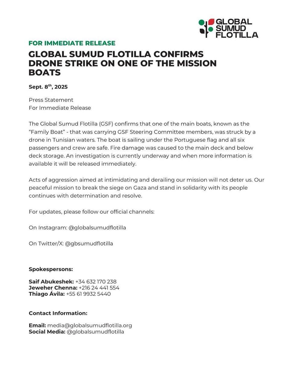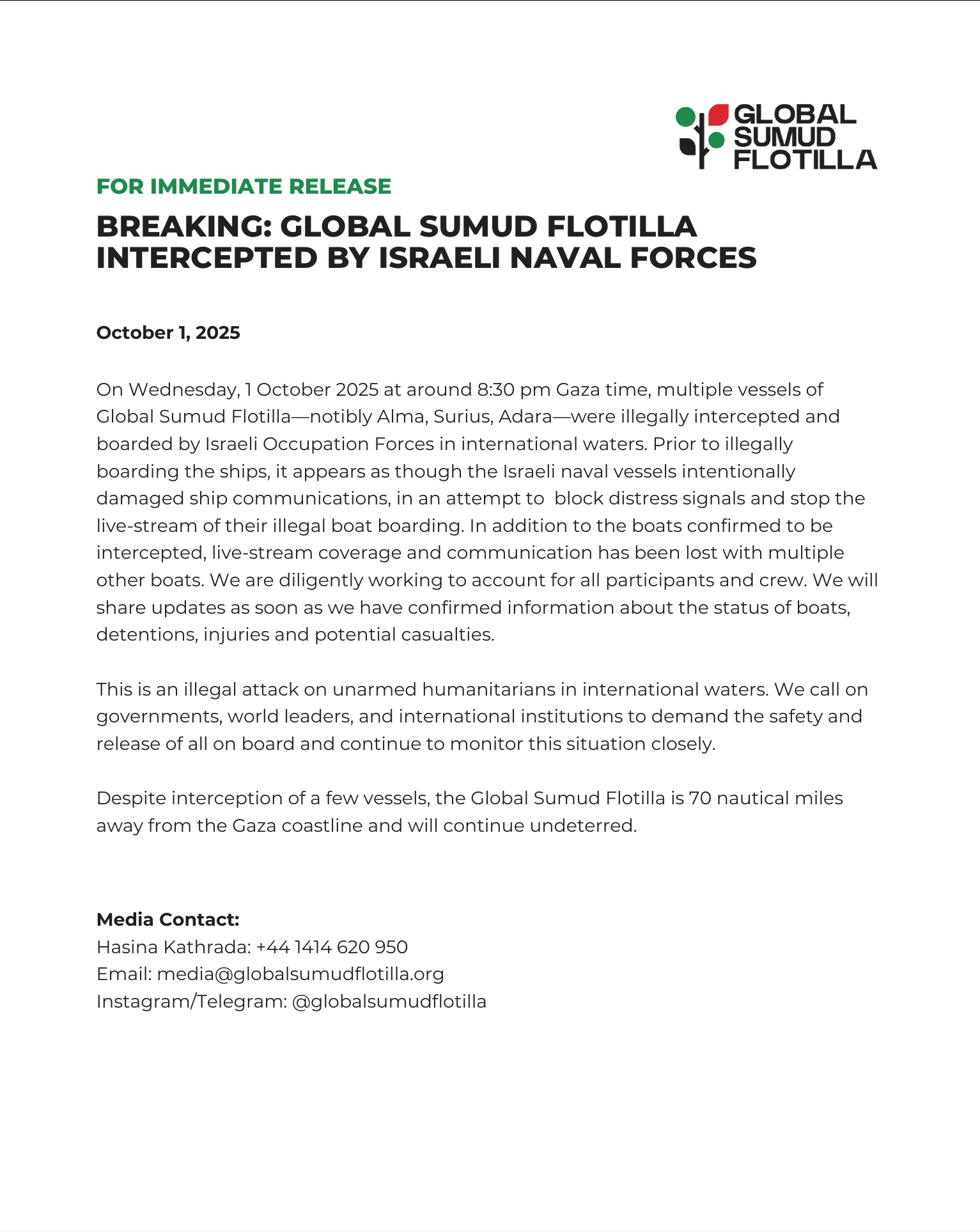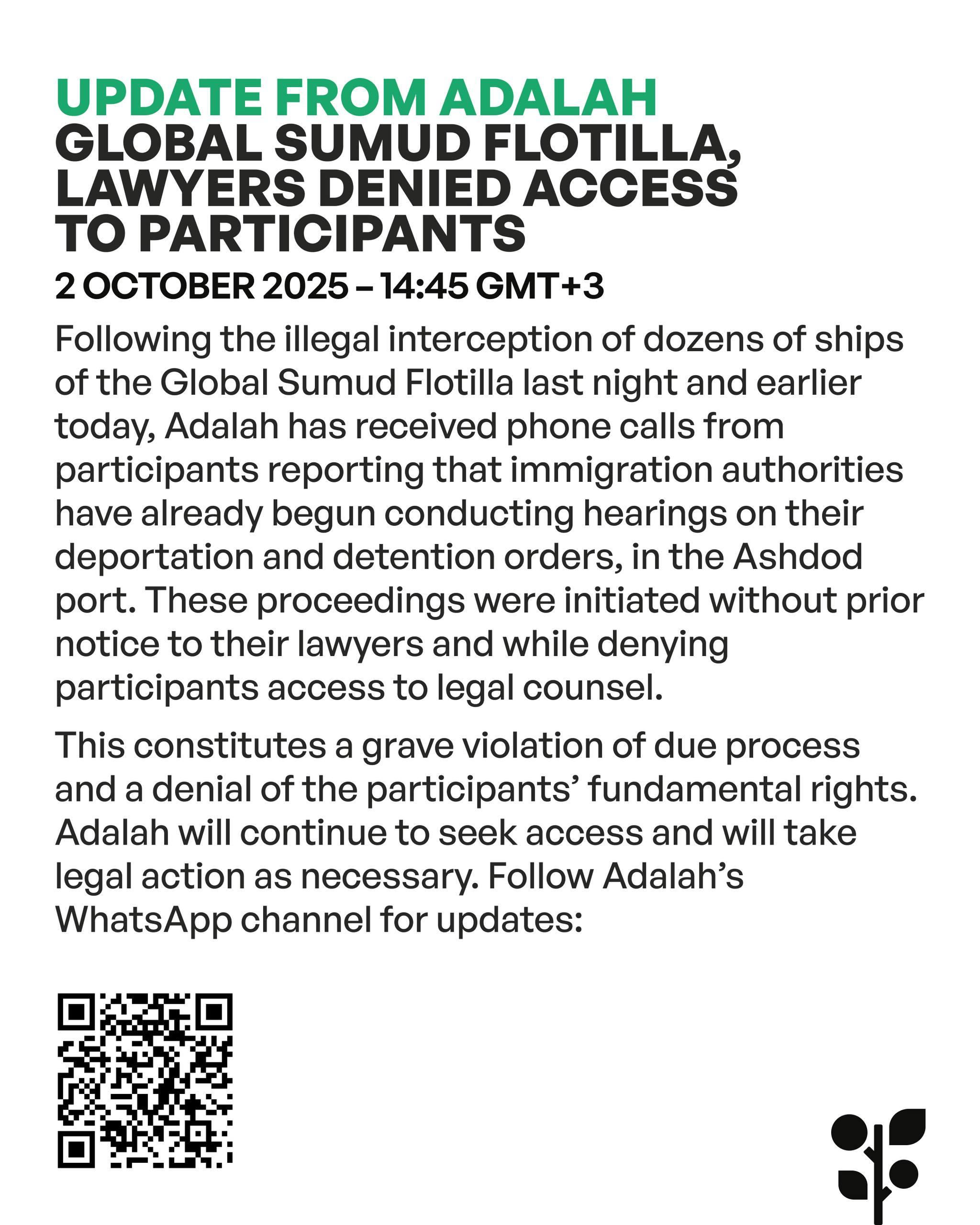 Six Global Sumud Flotilla participants are still held hostage by Israel after being illegally abducted in international waters. One Nigerian participant from the Omar Al-Mukhtar Flotilla and 145 participants of Freedom Flotilla Coalition and Thousand Madleens to Gaza are also still in detention.