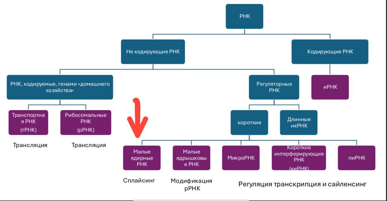 В общем, сплайсинг это нарезка такая, когда из матричной рнк убирают «ненужные» места, и вот этот процесс и регулирует наша мяРНК